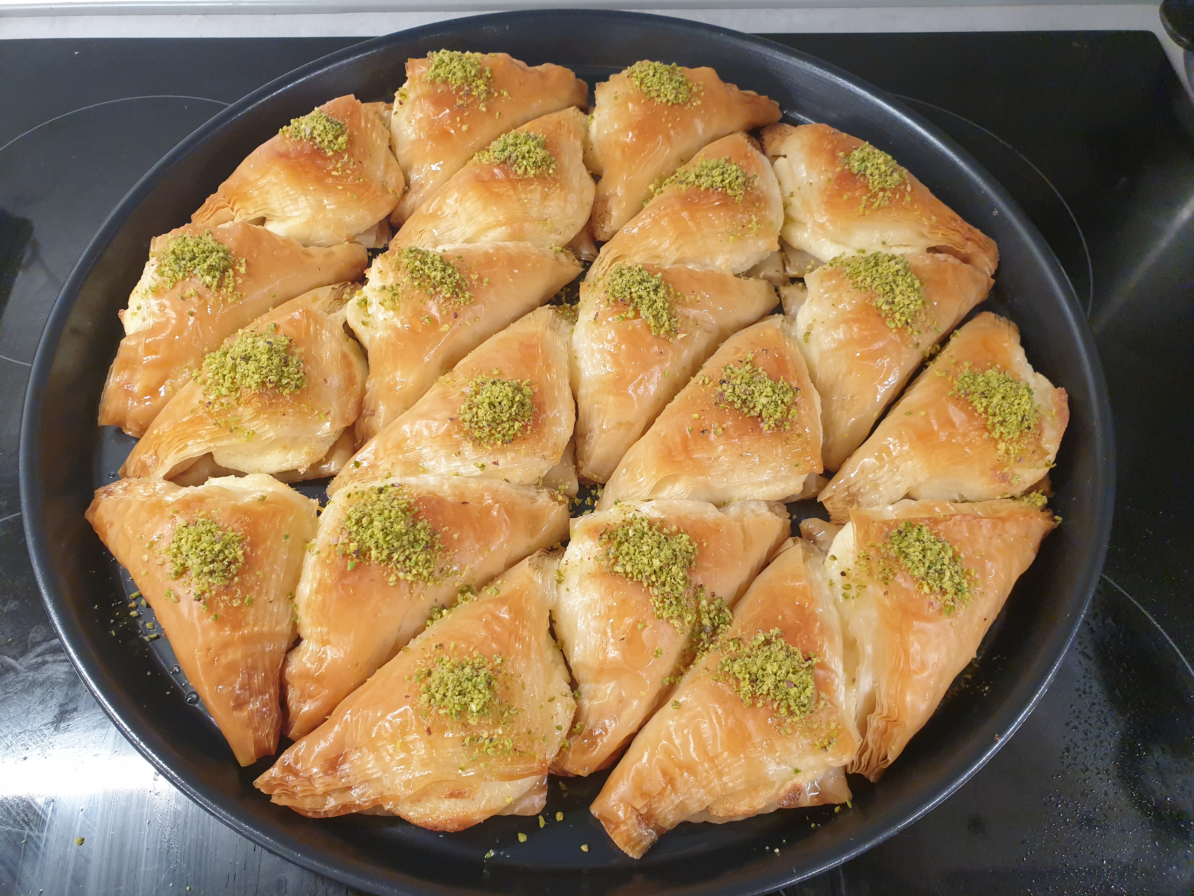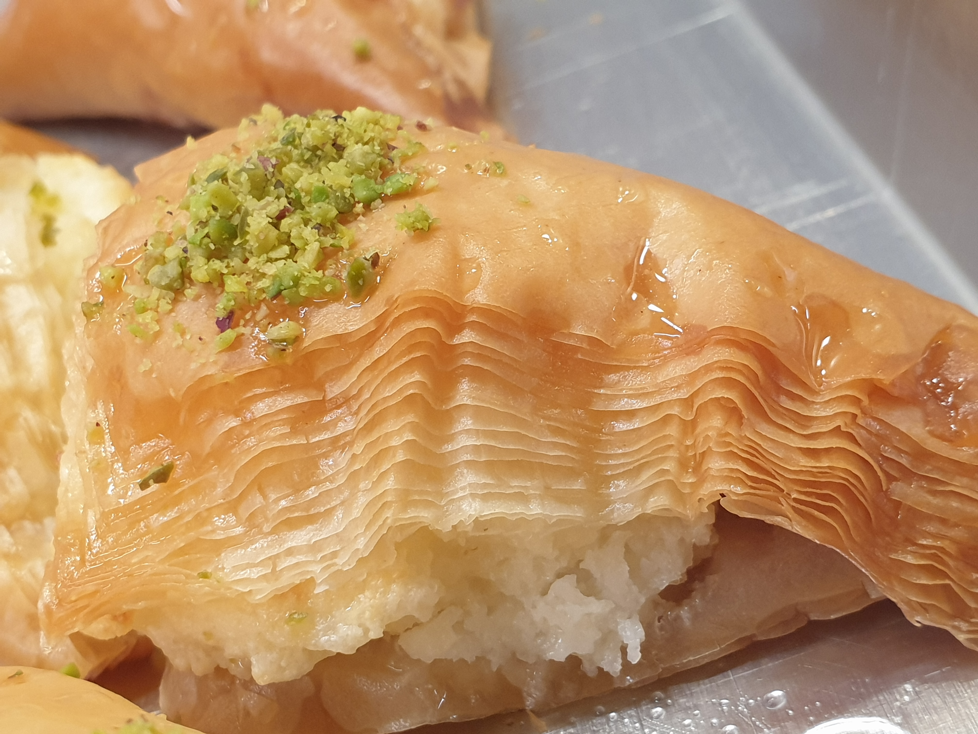 Ingredients: semolina, wheat flour, butter ghee, yeast, sugar, water, invert sugar, whole milk powder, rose water, orange blossom water, stuffed with pistachios.