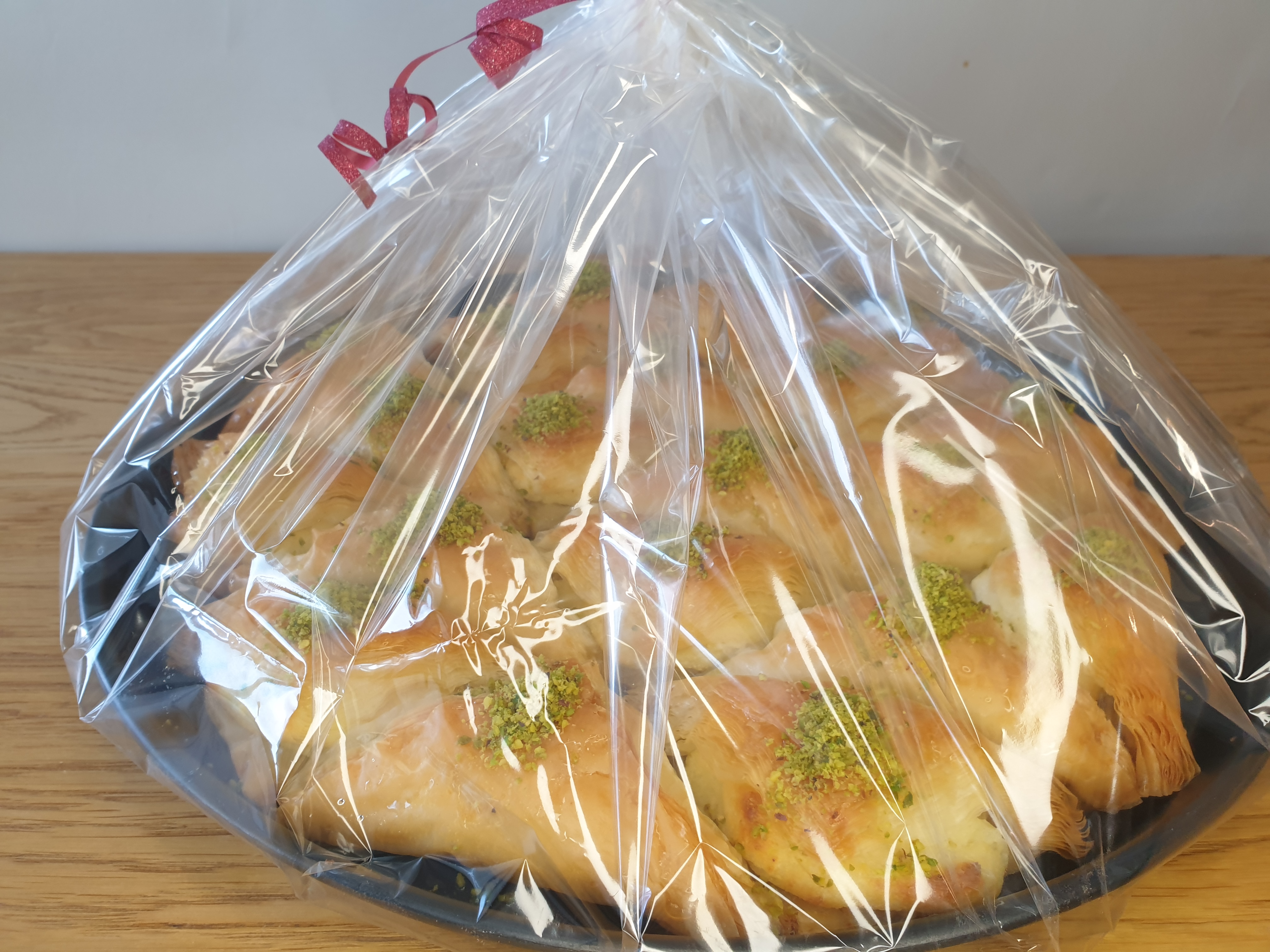 Ingredients: Phyllo Dough (Wheat Flour (Malted Barley Flour, Niacin, Iron, Thiamine Mononitrate, Riboflavin, Folic Acid, Enzyme), Filtered Water, Corn Starch, Salt), Sugar, ghee, Pistachios, rose water, orange blossom water.