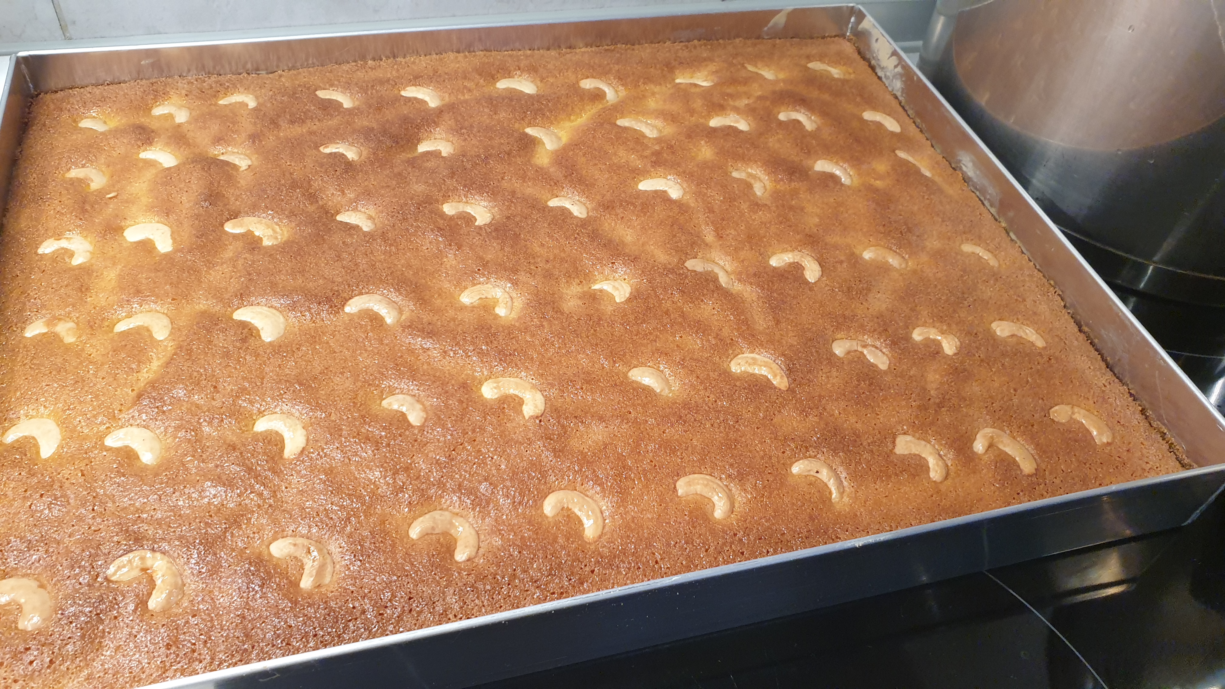 Ingredients: semolina, coconut, ghee, sugar, yeast, baking powder, rose water, orange blossom water.