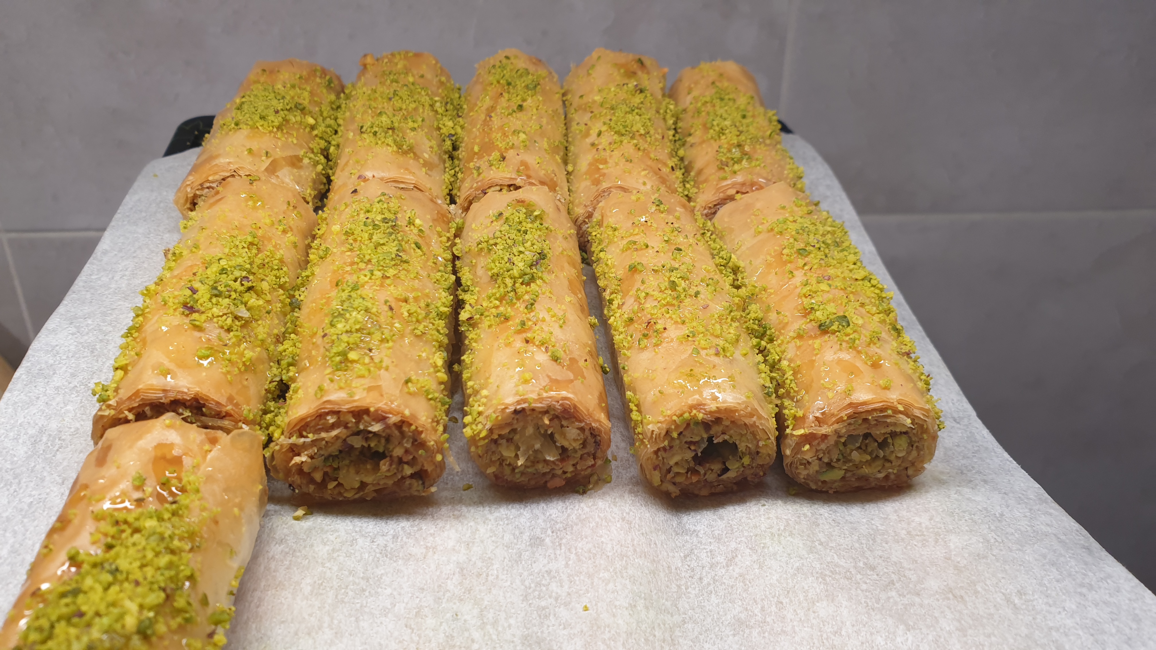 Box containing 55 pcs pistachio baklava rolls (About 970 g).